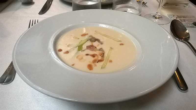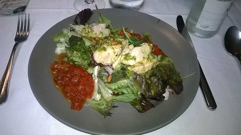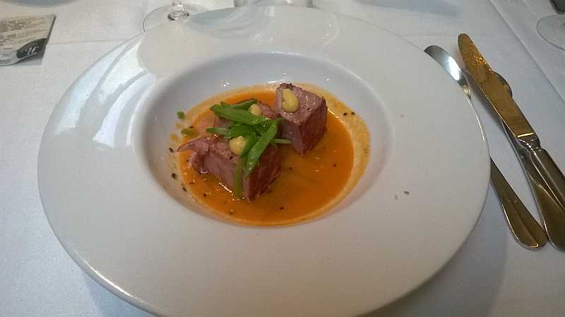 De primeros platos comimos; canelones gratinados, ensalada de pollo confitado a baja temperatura con tomates asados, pesto de albahaca y piñones y crema de almendras, y de segundos; solomillo de cerdo con salteado de arroz especiado y salsa, confit de pato sobre parmentier, cebolla confitada y reducción de vino dulce y lomo de atún a la llama con tartar de mango y crema suave de zanahoria y naranja y, para terminar, los postres. ¡Todo estaba muy rico!