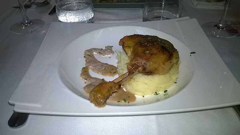 Confit de pato sobre parmentier, cebolla confitada y reducción de vino dulce.