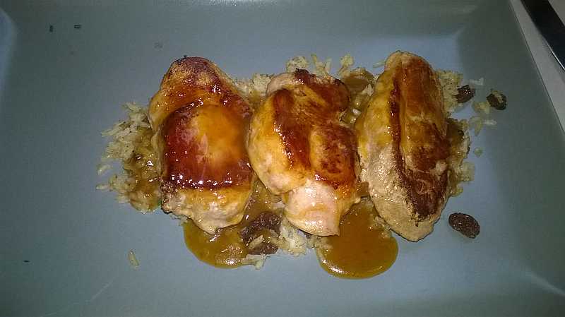 Solomillo de cerdo con salteado de arroz especiado y salsa.