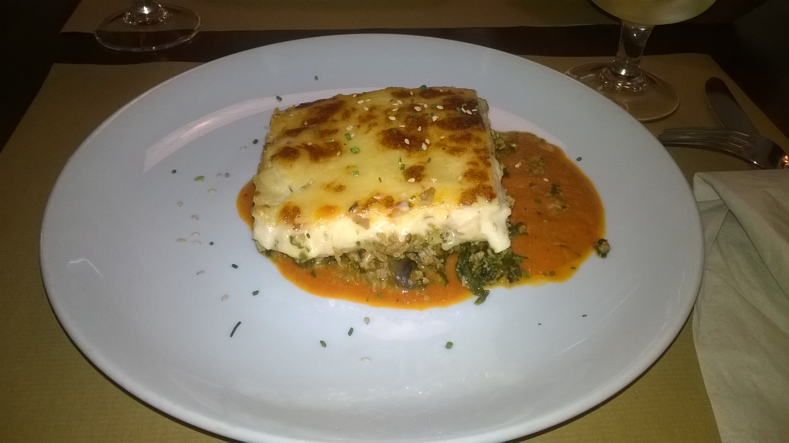 Lasaña de champiñones, espinacas y proteína de soja con salsa de tomate casera gratinada con parmesano y mozzarella