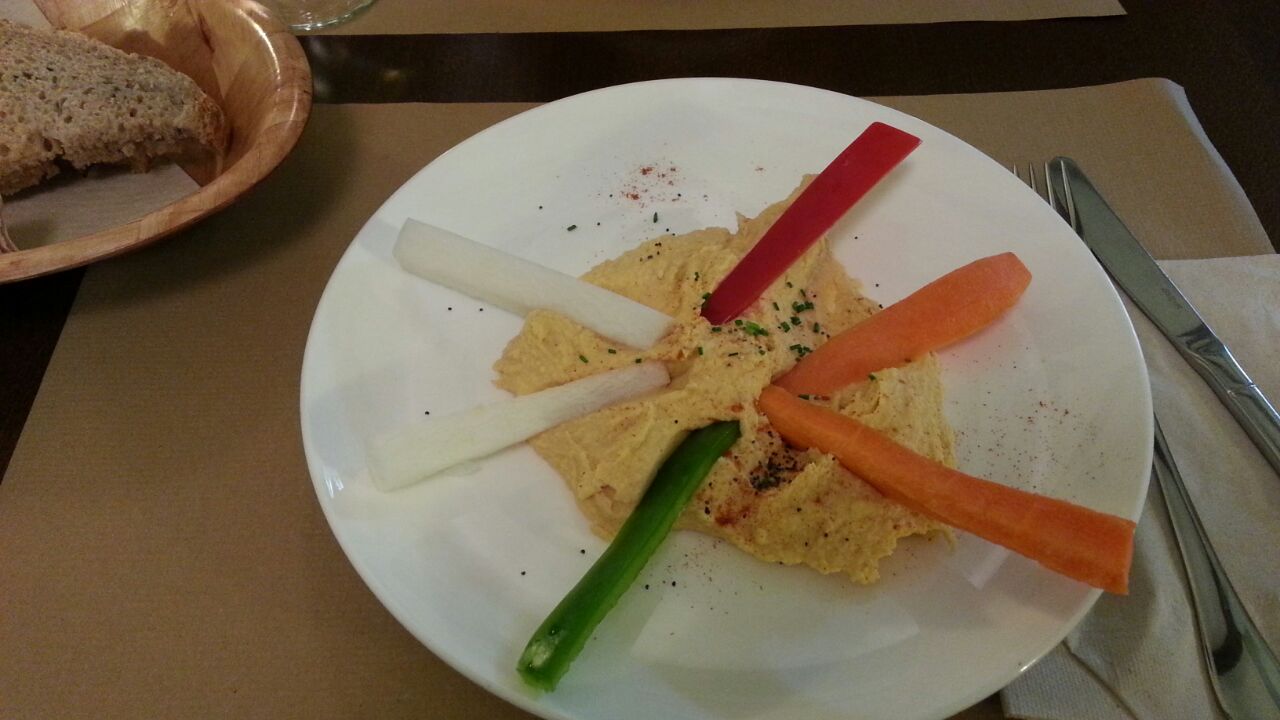 Hummus con crudités de zanahoria, nabo y pimientos.